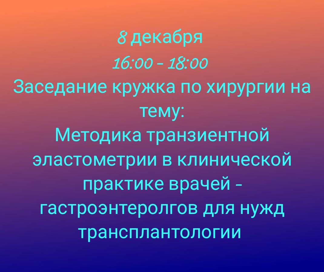 8 Декабря 16:00 — 18:00 Заседание СНК по хирургии. Методика транзиентной эластометрии в клинической практике врачей-гастроэнтерологов для нужд трансплантологии.